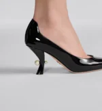 New for Fall 2024, the Dior Tribales pump displays couture appeal. The black patent calfskin upper is accented by a graphic cutout on the heel counter. Its 8-cm (3) comma heel is accented with white resin pearls. The rear pearl features a gold-tone CD signature inspired by the namesake earrings. The sophisticated pump has a pointed toe and can be paired easily with any evening wear.