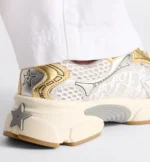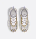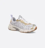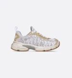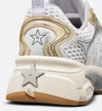 The Dior Vibe sneaker reimagines the classic running shoe with the House’s couture spirit. White mesh printed with the Dior Oblique motif is combined with gold- and silver-tone laminated leather-effect panels for a modern play on contrasts. The design is further punctuated with hallmark accents like 3D-effect detailing, a lucky star symbol on the back and signatures on the tongue and rear tab. Completed by an ultralightweight sole adorned with a gray star, the sneaker will complement any casual or elegant attire for a contemporary look.