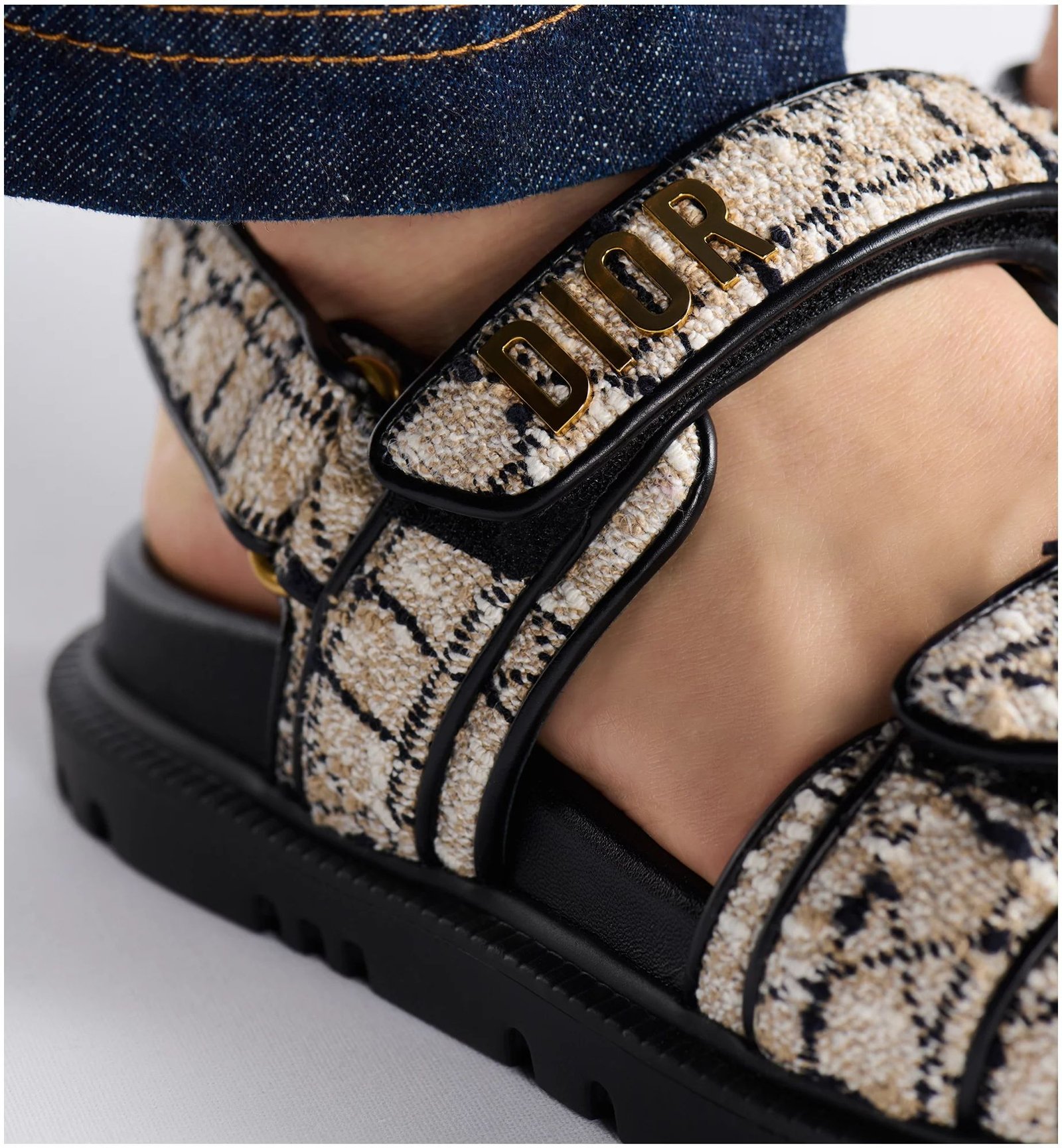 The Dioract sandal presents a modern silhouette in beige and black Cannage tweed. The style features an anatomically shaped sole made in ultralightweight and comfortable leather, as well as self-fastening straps further embellished with a gold-finish metal Dior signature on the upper strap to complete the design. The sandal will lend a contemporary touch to any look.
