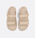 The powder beige lambskin Dioract sandal has a modern silhouette. The style features an anatomically shaped insole made with an ultralightweight and comfortable leather. Self-fastening straps further enhanced by a gold-finish metal Dior signature on the upper strap complete the design. The sandal will lend a contemporary touch to any look.