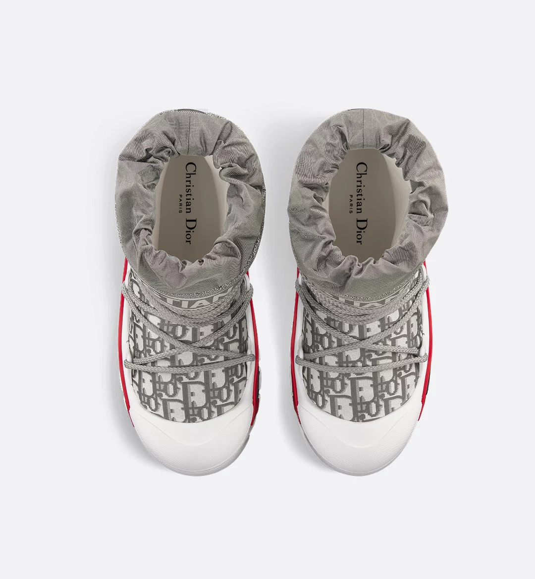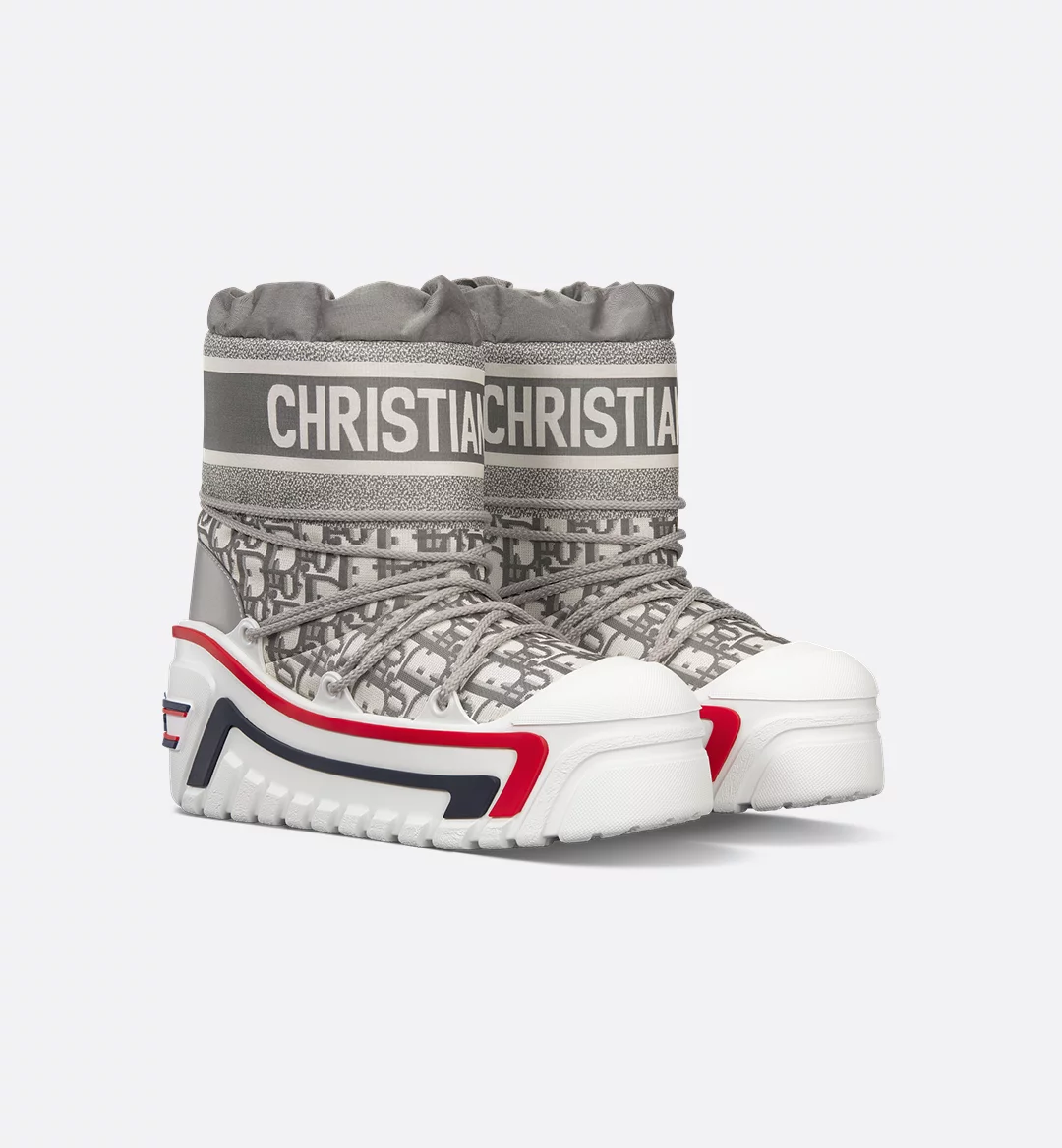 The apr??s-ski boot, created for the DiorAlps capsule, is distinguished by its bold design. The stone gray Dior Oblique shiny nylon upper is completed by cross lacing for an optimal fit. The Christian Dior signature adorns the upper and the supple, lightweight white three-tone sole, which is further embellished with a hallmark star. The technical ankle boot, with its low silhouette, may be worn in either the city or the mountains, and may be coordinated with other DiorAlps creations.