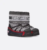 The apr??s-ski boot, created for the DiorAlps capsule, is distinguished by its design. The black and white Plan de Paris shiny nylon upper is inspired by House archives and structured around Avenue Montaigne. Completed by cross lacing for an optimal fit, it showcases the Christian Dior signature on the upper as well as the supple, lightweight black three-tone sole, further embellished with a hallmark star. The technical ankle boot, with its low silhouette, may be worn in either the city or the mountains, and may be coordinated with other DiorAlps creations.