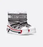 The apr??s-ski boot, created for the DiorAlps capsule, is distinguished by its design. The white and black Plan de Paris shiny nylon upper is inspired by House archives and structured around Avenue Montaigne. Completed by cross lacing for an optimal fit, it showcases the Christian Dior signature on the upper as well as the supple and lightweight white three-tone sole, further embellished with a hallmark star. The technical ankle boot, with its low silhouette, may be worn in either the city or the mountains, and may be coordinated with other DiorAlps creations.