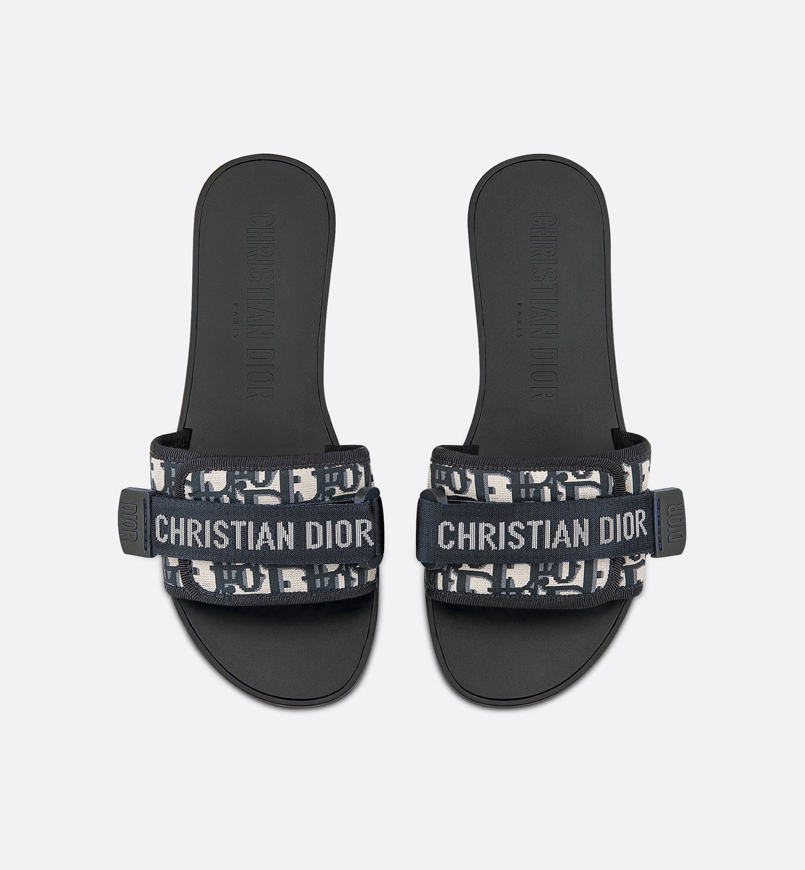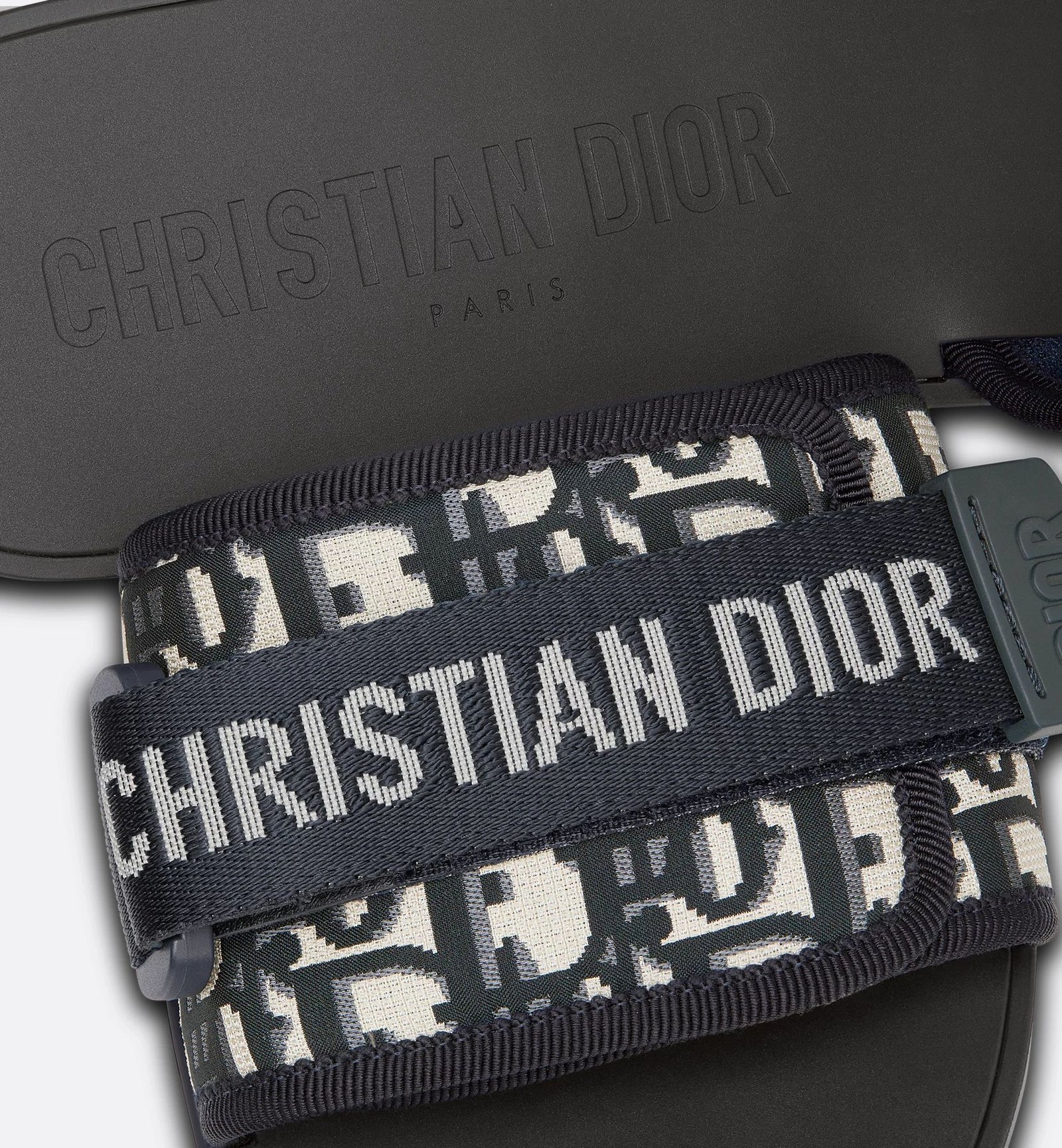 The Dio(r)evolution slide is an essential wardrobe piece. The adjustable self-fastening strap showcasing the Christian Dior signature covers a shiny technical fabric upper printed with a deep blue Dior Oblique motif. The supple tonal rubber sole builds on the casual appeal of the style.