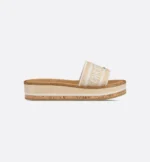 New for Fall 2024 and part of the Dioriviera capsule, the Dway platform slide has a modern and casual look. The natural raffia and white cotton upper is embroidered with the instantly recognizable Christian Dior Paris signature. Completed by a thick sole in wood, white rubber and cork, the shoe can be coordinated with other creations from the Dioriviera capsule.