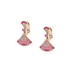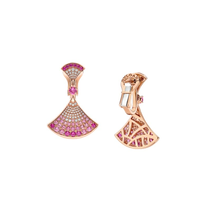 The Divas’ Dream 18K rose gold earrings are a subtle expression of joyful femininity, with a vibrant and colorful design that interprets the iconic fan motif. The collection’s signature aesthetic is elegantly presented, with round brilliant-cut pink sapphires and rubies, and pavé diamonds, reflecting Bvlgari’s Roman heritage. This timeless and elegant creation celebrates the beauty of nature.