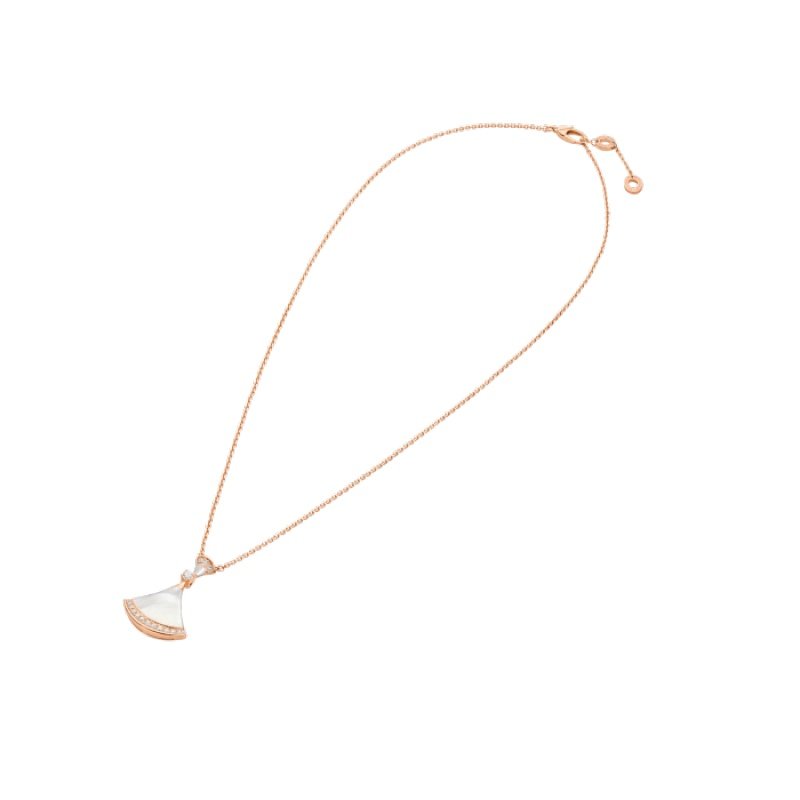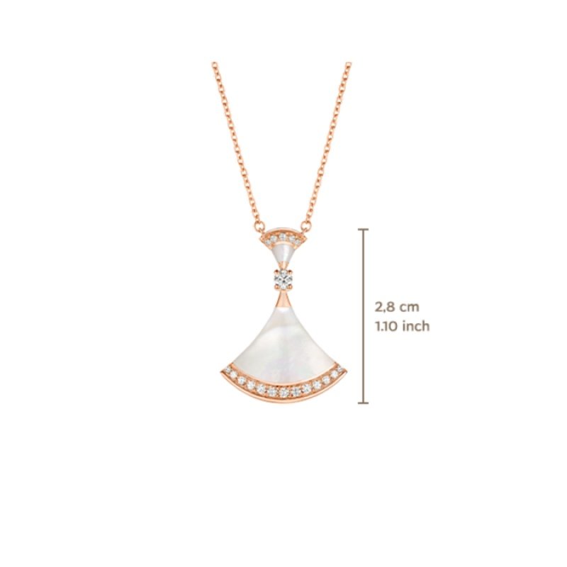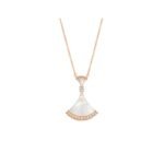 The Divas’ Dream necklace embodies Italian elegance and unleashes feminine power with a mysterious and unforgettable temperament. The charming and exquisite pendant is decorated with a fan-shaped pattern, inspired by the mosaic decoration of the Caracalla Baths in Rome, and highlights the historical origins of Bvlgari and the “Eternal City” with a modern and fashionable design and a combination of exquisite gemstones. Divas’ Dream necklace in 18K rose gold, inlaid with mother-of-pearl and a round brilliant-cut diamond, decorated with pavé diamonds.