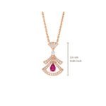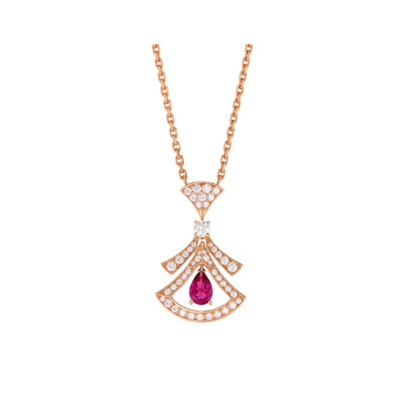 The Divas’ Dream necklace in 18K rose gold is a subtle expression of joyful femininity, with a colorful design that interprets the iconic fan pattern. The signature aesthetic of the collection is presented in a diamond-set hollow pendant, with a pear-shaped rubellite in the center adding a dynamic touch to the jewelry, reflecting Bvlgari’s Roman heritage. This piece is elegant and timeless, celebrating the beauty of nature. Divas’ Dream necklace in 18K rose gold, set with a pear-shaped rubellite and brilliant-cut diamonds.