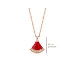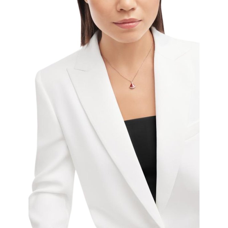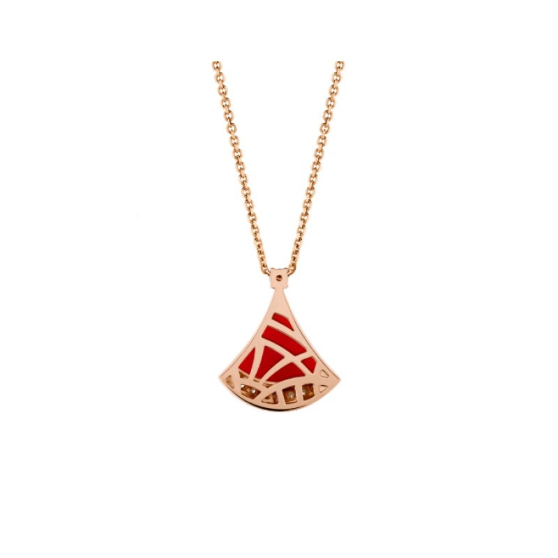 The Divas’ Dream necklace in 18K rose gold is a subtle expression of joyful femininity, with a colorful design that interprets the iconic fan pattern. The signature aesthetic of the collection is presented through a delicate pendant, which is cleverly set with a carnelian and embellished with pavé diamonds, reflecting Bvlgari’s Roman heritage. This piece is elegant and timeless, celebrating the beauty of nature.