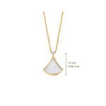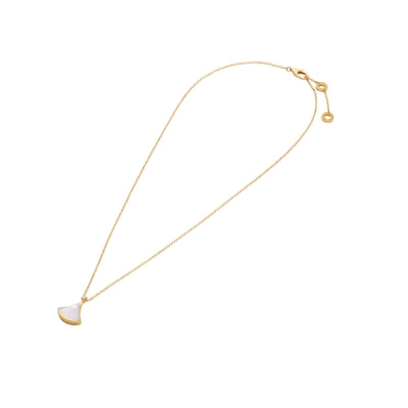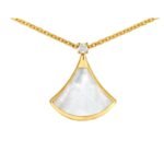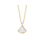 Inspired by the elegance of women and the charm of the Eternal City, the Divas’ Dream necklace pays tribute to the extraordinary Roman spirit of the woman. A necklace that embodies femininity, refinement and elegance, the beauty of the marble of the Baths of Caracalla and the curves of the fan-shaped mosaics, the true essence of Italian beauty. Divas’ Dream necklace in 18K yellow gold, pendant set with a diamond and mother-of-pearl.