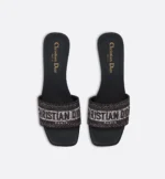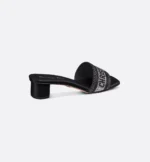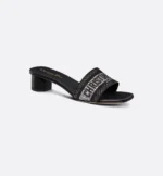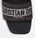 The Dway slide is a timeless, hallmark piece. The black cotton upper is embroidered with metallic tonal thread and silver-tone strass, displaying the instantly recognizable Christian Dior Paris signature. Featuring an elegant square toe and 3.5 cm (1.5) cylindrical heel, the slide will effortlessly complete a wide range of looks.