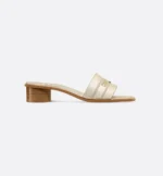 The Dway heeled slide revisits a hallmark and timeless design. The laminated calfskin upper is embroidered with the Christian Dior Paris signature in gold-tone metallic thread, lending an instantly recognizable touch. Completed by a 3.5-cm (1.5-inch) cylindrical heel and softly squared toe, the slide will elevate outfits with a modern touch.