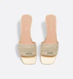 Part of the Dior?Or capsule collection, the Dway heeled slide reframes a hallmark creation in a modern variation. The design is offered in elegant gold-tone cotton embroidered with metallic thread and strass. The embroidered upper, with its Christian Dior Paris signature, makes it an immediate statement piece, while the square toe accents its contemporary silhouette. Featuring a 3.5 cm (1.5) cylindrical heel, the slide lends a modern touch to any attire and can be paired with other Dior?Or creations.