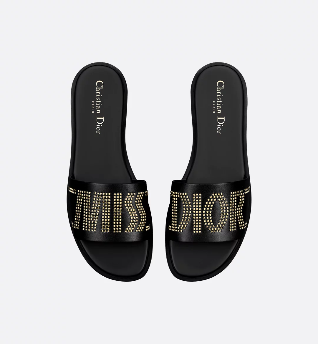 The Dway slide showcases the collection’s signature Miss Dior motif, inspired by the Marc Bohan for Dior archives in a modern take on the 1960s. The black calfskin upper features a gold-finish studded Miss on one foot and Dior on the other. The sleek design slips on easily for a laid-back style. The shoe can be paired with other Miss Dior creations.