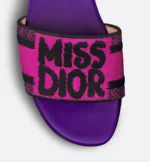 The Dway slide features the black Miss Dior Graffiti motif, a nod to the 1967 debut ready-to-wear collection and a manifesto to Maria Grazia Chiuri’s signature celebration of feminism. The fuchsia and black embroidered cotton upper is contrasted with the purple leather insole. The sleek design slips on easily for a laid-back style. The shoe can be paired with other Miss Dior Graffiti creations.