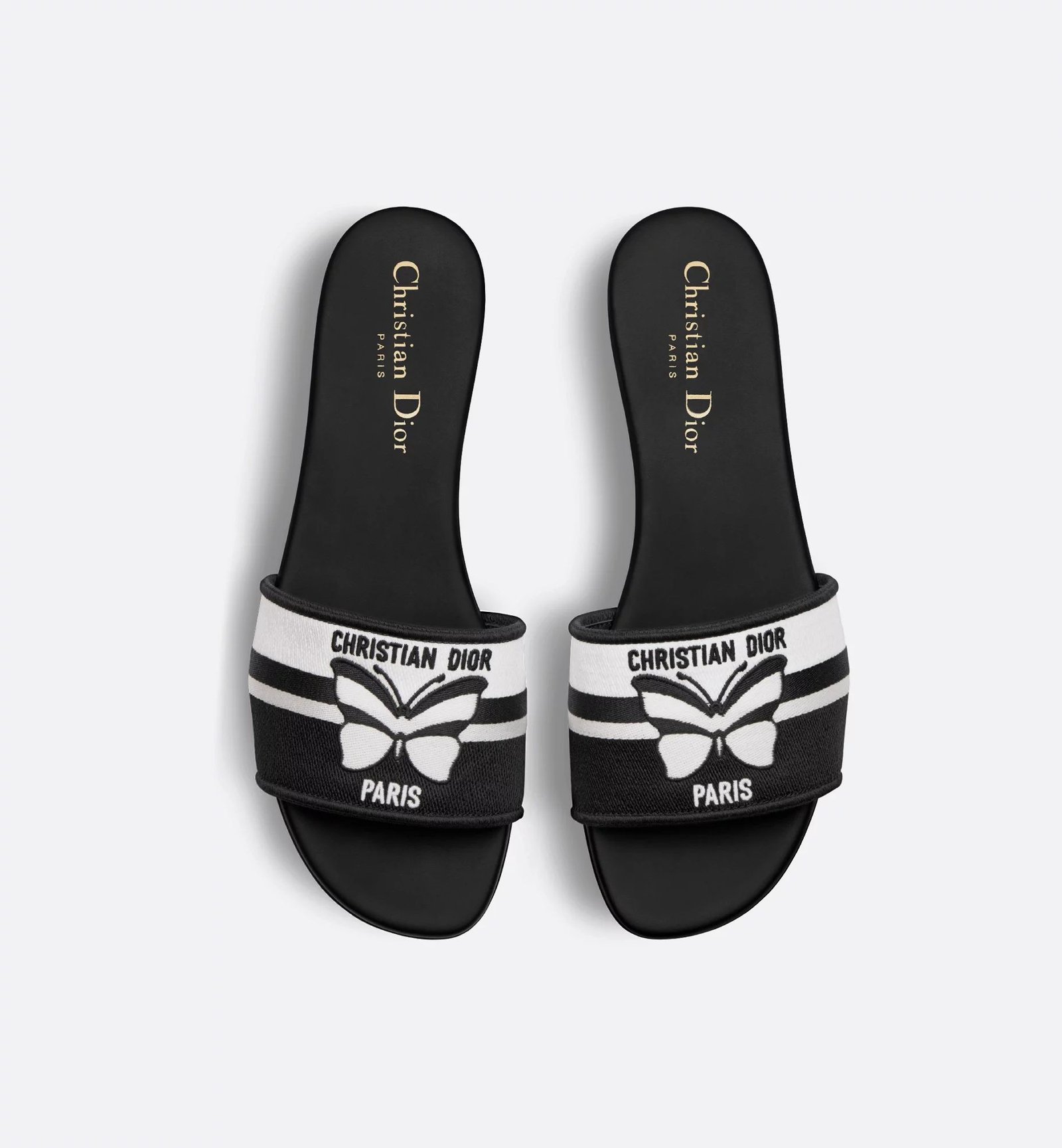 The Dway slide is an emblematic and timeless silhouette. The black and white embroidered cotton upper showcases the Christian Dior Papillon motif, offering a graphic take on the season’s signature theme. Its streamlined design allows the sandal to easily slip on and complete any laid-back attire.
