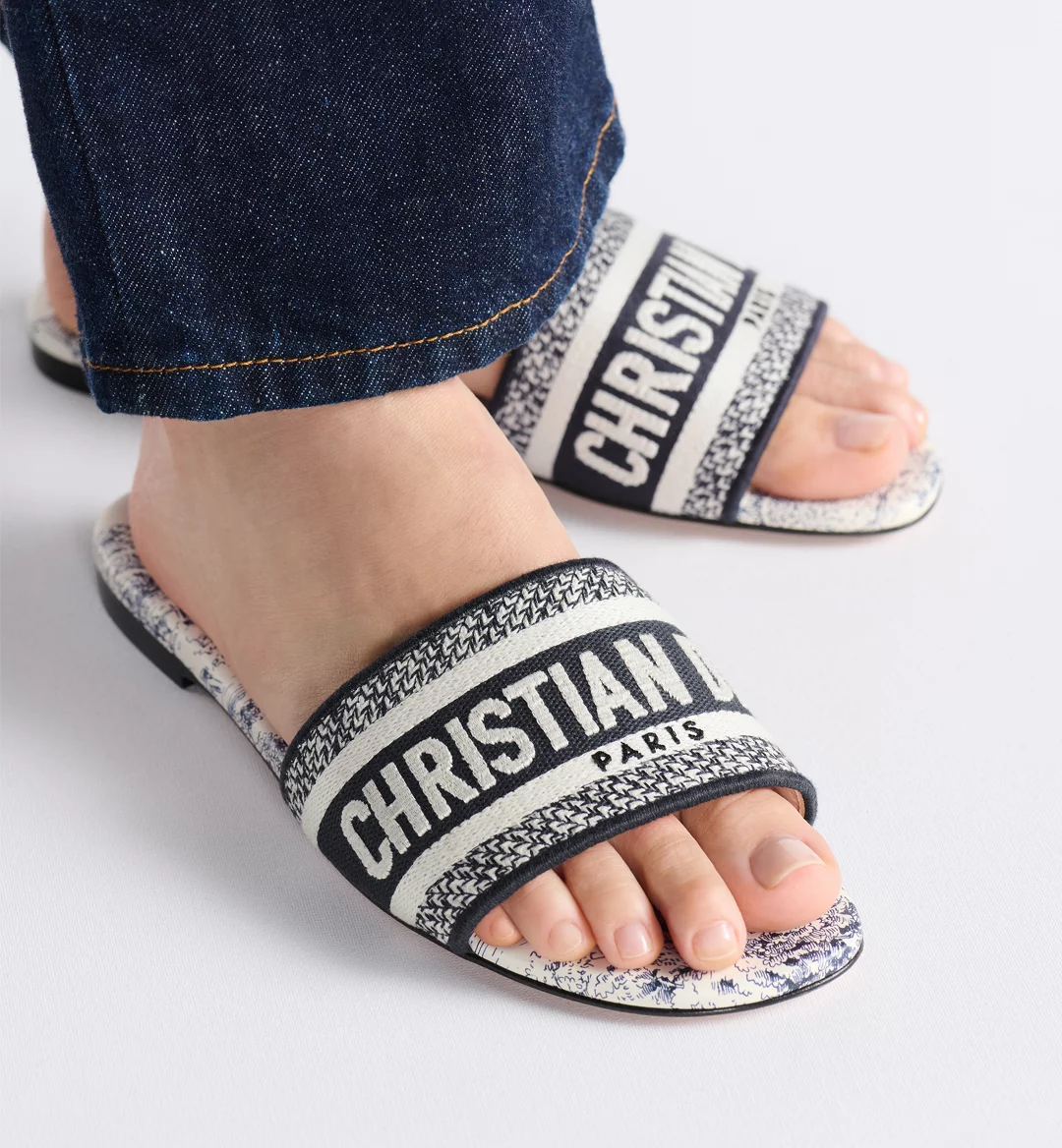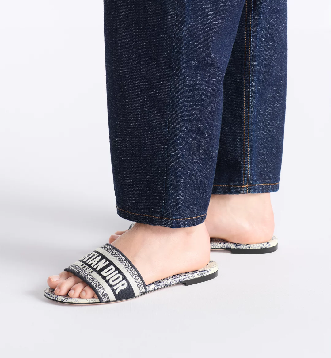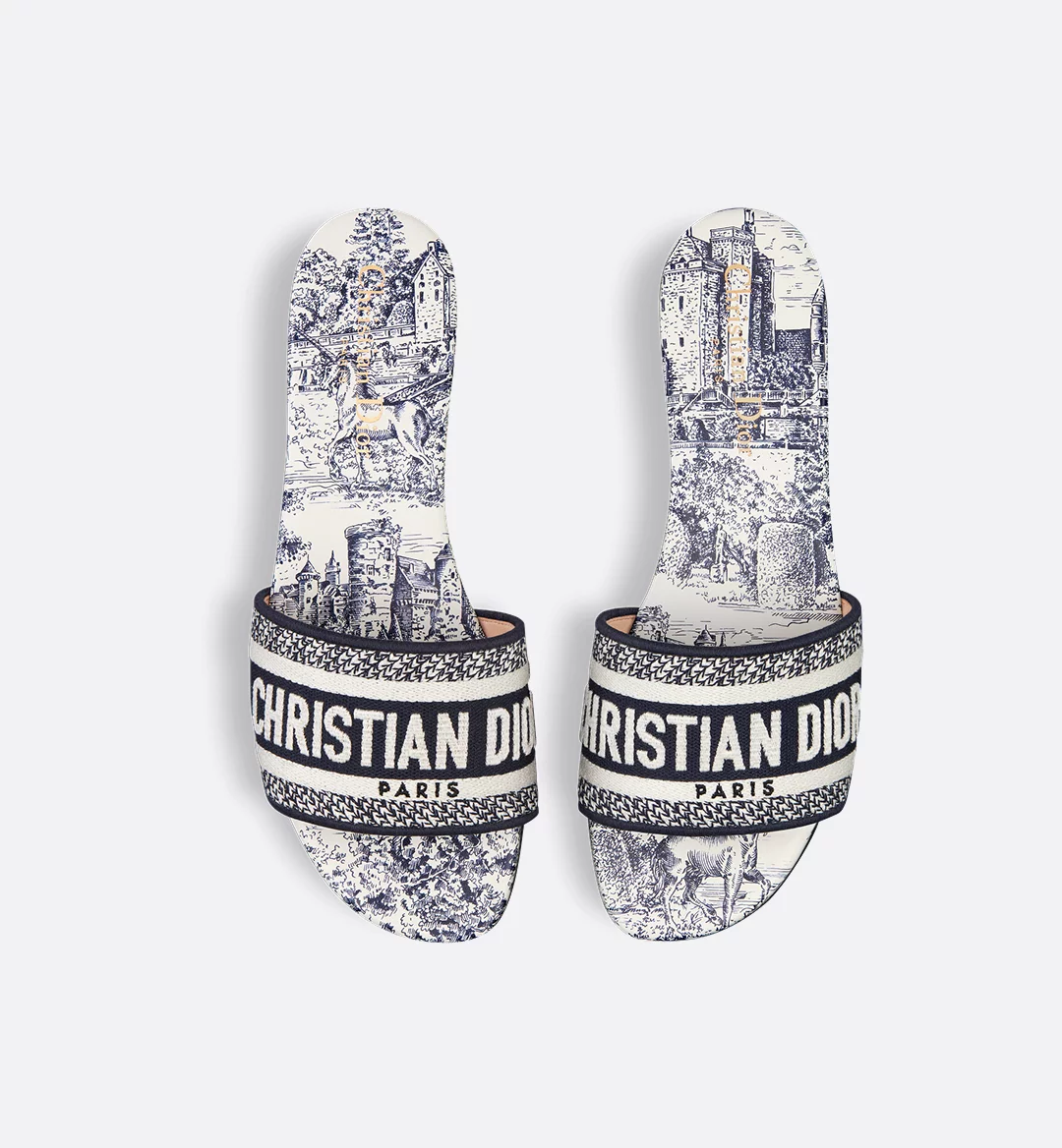 The Dway slide is a hallmark and timeless style showcasing the deep blue Toile de Jouy Scotland motif. Capturing the essence of the collection’s Scottish inspiration, it features Scottish folklore through animals, historical symbols and emblematic castles. The upper has an embroidered Christian Dior Paris signature for an instantly recognizable touch. Its streamlined silhouette makes it easy to slip on to complete a relaxed look that will pair well with other Toile de Jouy Scotland creations from the collection.