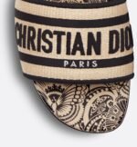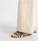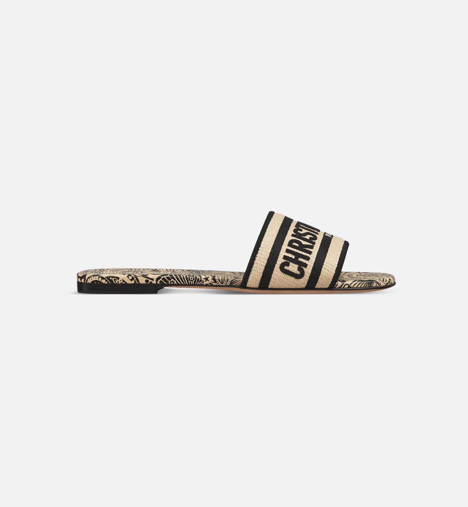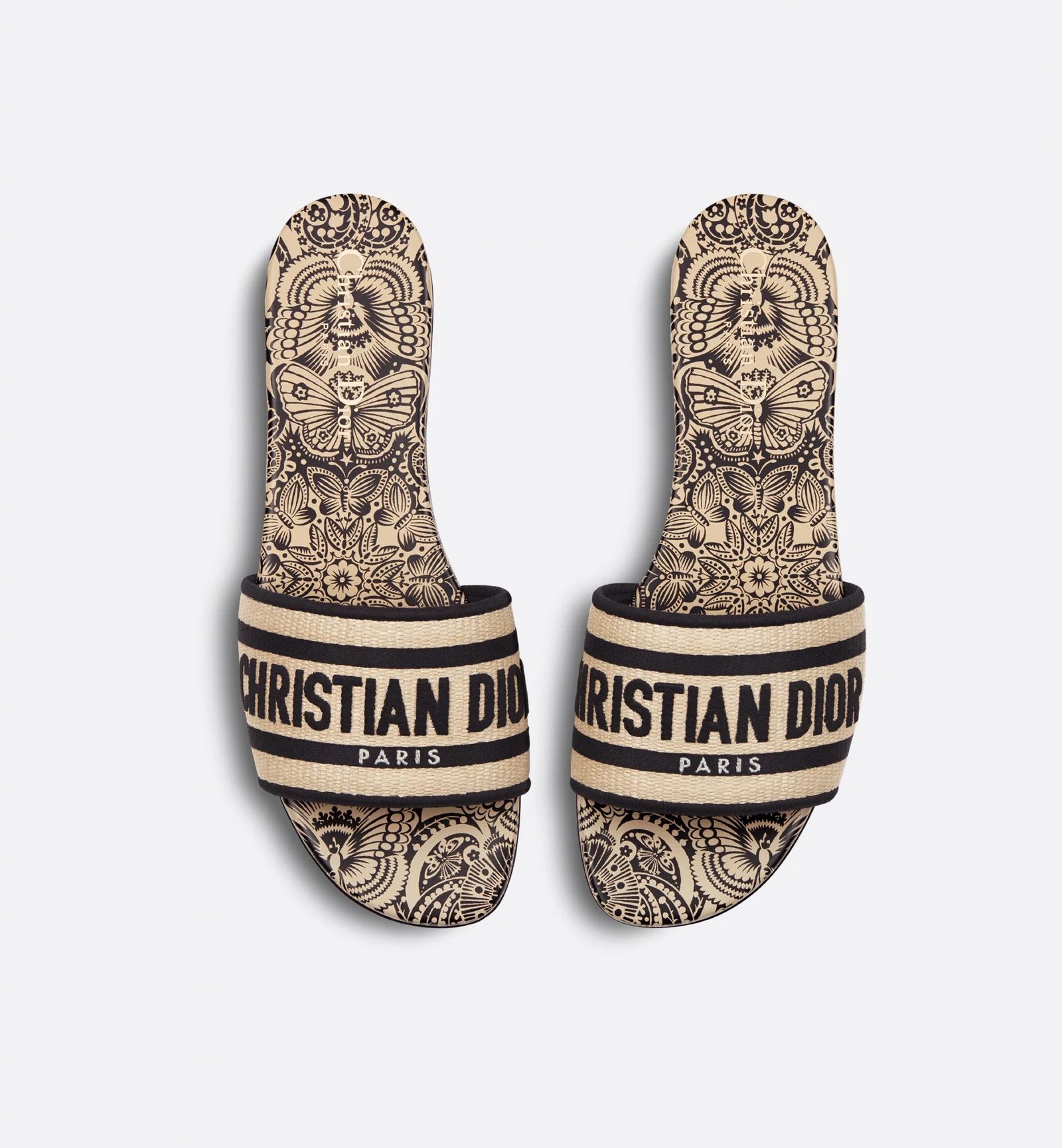 The Dway slide is a hallmark and timeless style featuring a the D-Butterfly Paisley motif, offering a modern and graphic take on the butterfly theme. The natural raffia upper is embroidered with the unmistakable Christian Dior Paris signature in black. Its streamlined silhouette makes it easy to slip on to complete a relaxed look and it can be paired with other D-Butterfly Paisley creations from the collection.