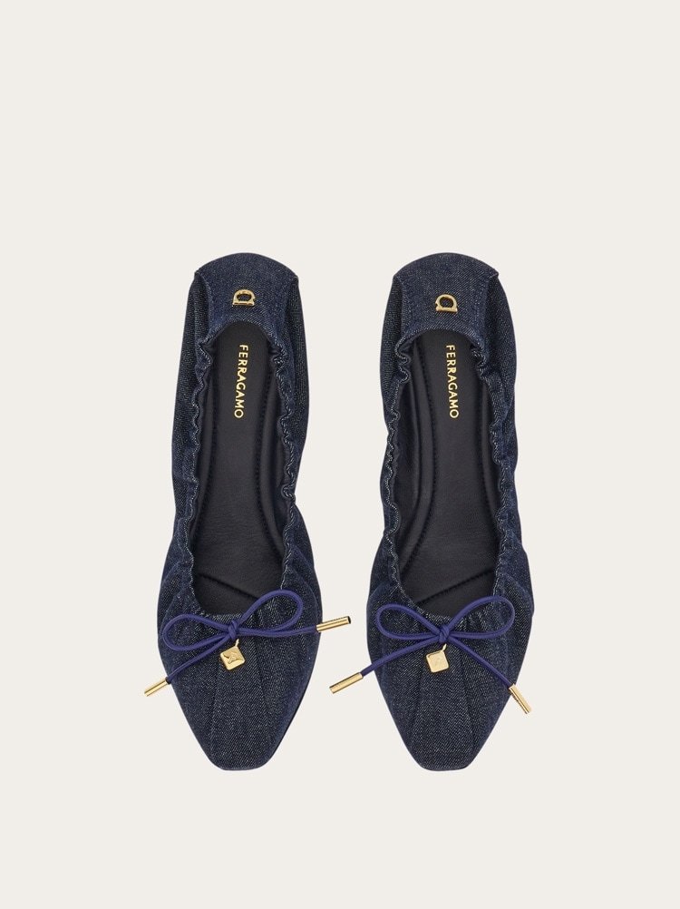 Like a glove. This season’s new take on the ballet flat is designed with both comfort and style in mind. The padded insole is enhanced with a 1cm wedge, while the gathered indigo denim upper holds the foot securely for a glove-like fit. Across the toe, a mini bow with custom aglets is secured via a Gancio buckle, and the slightly squared tip offers ease of movement with a contemporary appeal. Easy to fold and carry as a second pair in the custom dust bag.