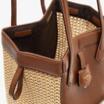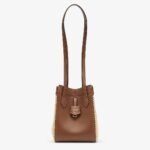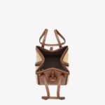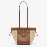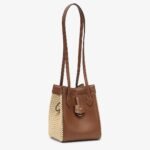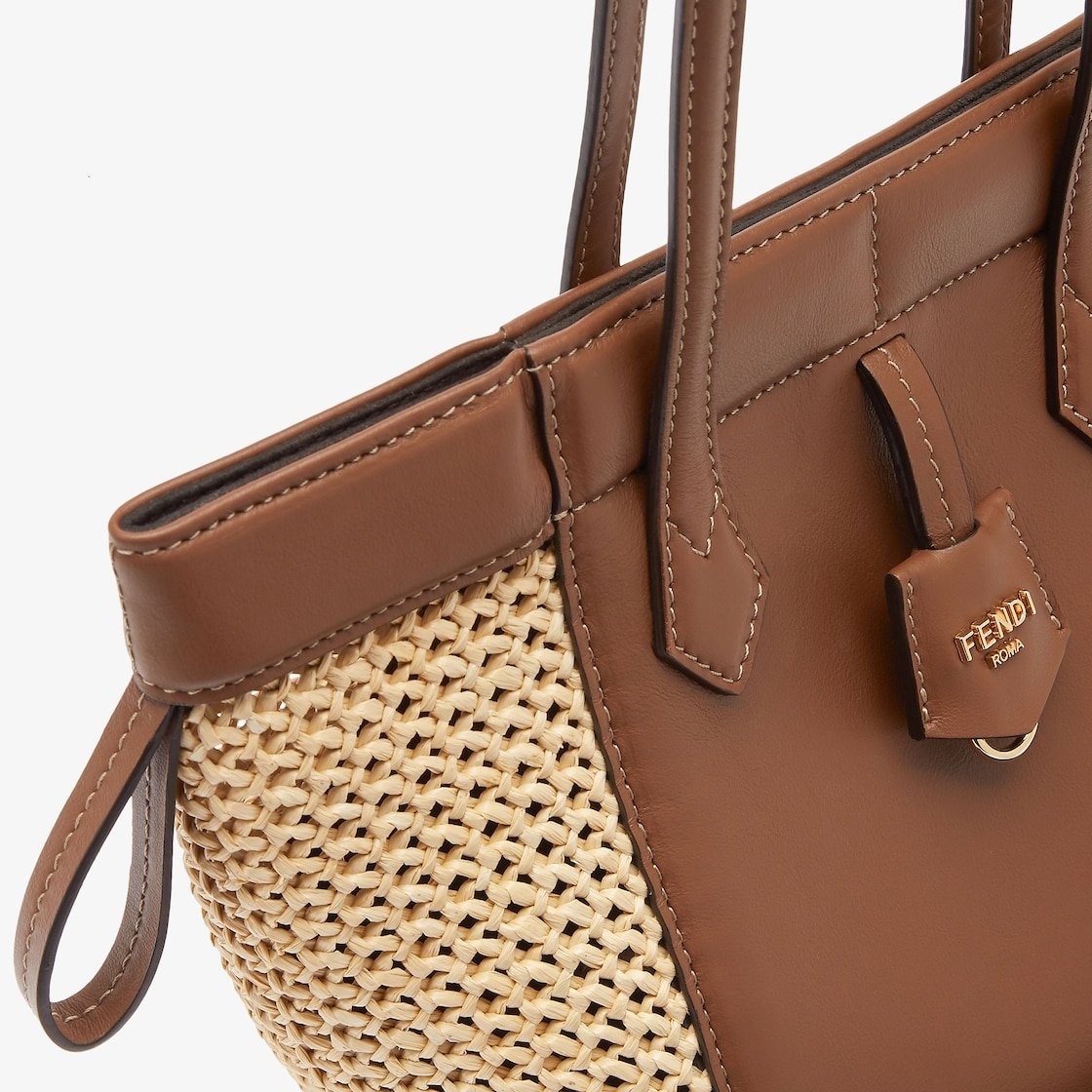 Mini Origami bag made of smooth brown leather with crochet straw panels. The style recalls the duality and creativity of Fendi with an innovative and transformable design:the ingenious closure with eight magnets means the bag can be folded, origami-style, transforming it from a bucket bag, when the magnets come together in the middle with a magic clasp, into a shopper by gently pulling the leather ties on the short shoulder straps on each side.