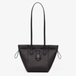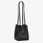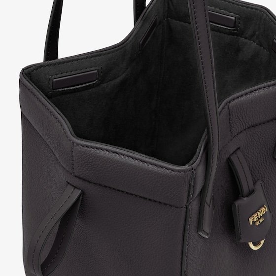 Mini Origami bag made of black full-grain leather. The style recalls the dual nature and creativity of Fendi with an innovative design that can be transformed:the ingenious closure with eight magnets means the bag can be folded, origami-style, transforming it from a bucket bag – when the magnets come together in the middle with a magic clasp – into a shopper by gently pulling the short shoulder straps on each side.