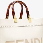 Medium Sunshine Shopper bag made of white leather with hot-stamped “FENDI ROMA” and stiff tortoiseshell plexiglass handles.