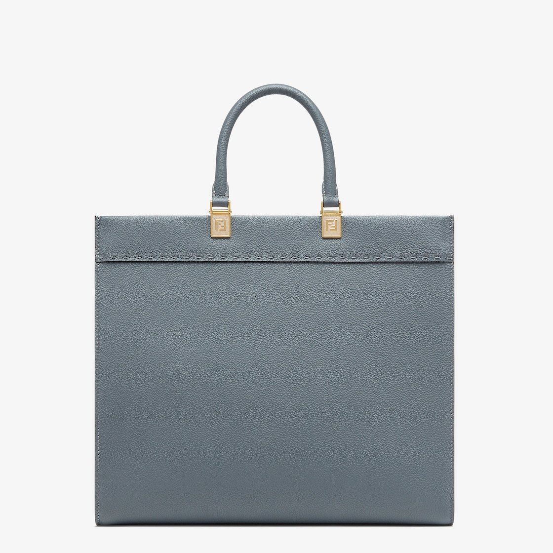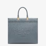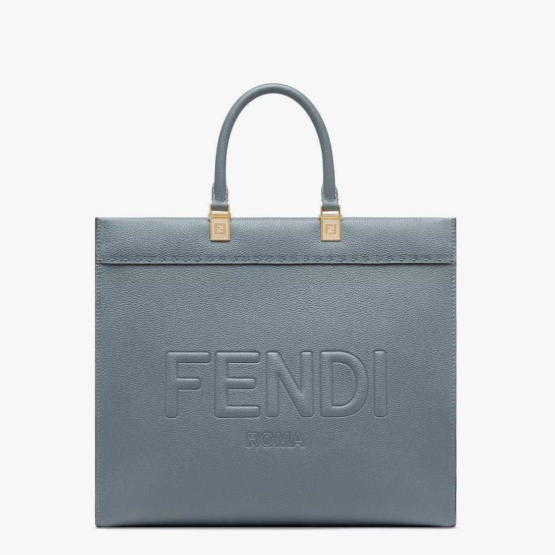 Medium Sunshine Shopper made of blue full-grain leather with embossed FENDI ROMA lettering and tone-on-tone leather tubular handles.