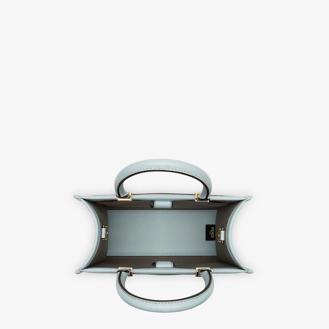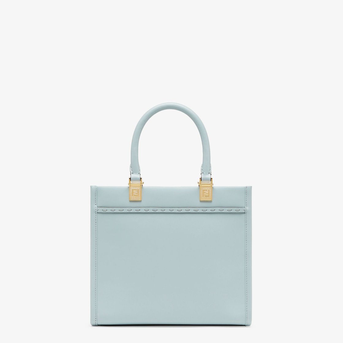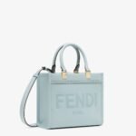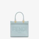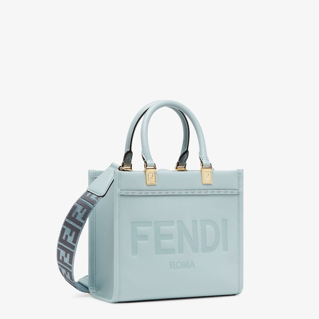 Small Sunshine Shopper made of light blue leather with a hot-stamped FENDI ROMA motif and tone-on-tone leather tubular handles.