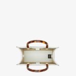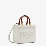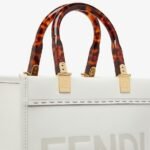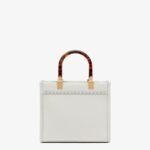 Small Sunshine Shopper bag made of white leather with hot-stamped FENDI ROMA lettering and stiff tortoiseshell plexiglass handles.