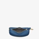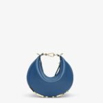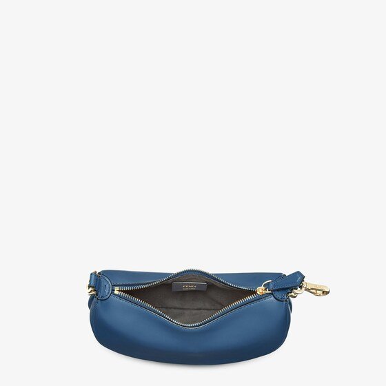 Made of blue calfskin, decorated with vintage gold-finish metal FENDI lettering on the base, visible when the bag is worn.