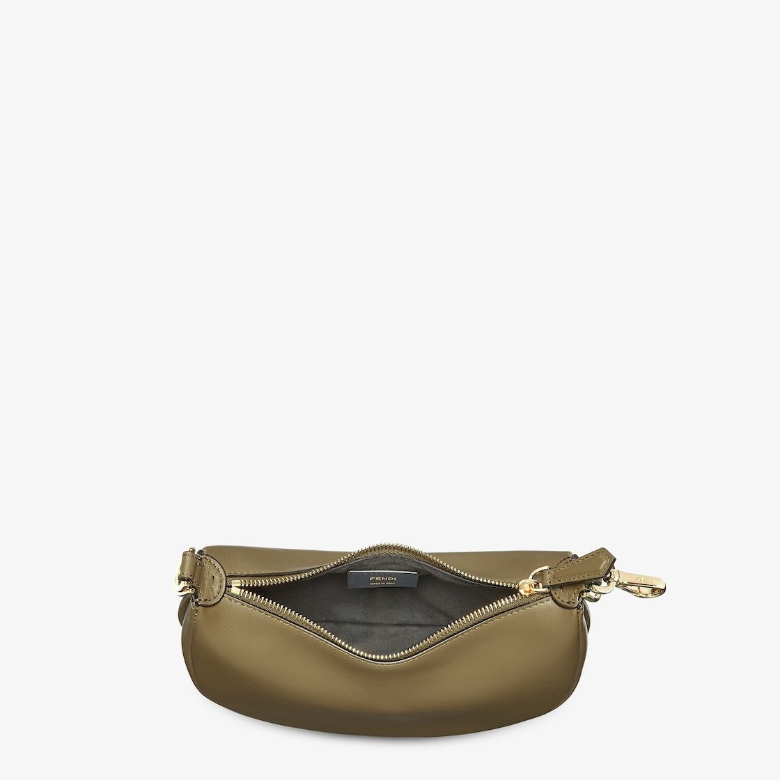 Made of green calfskin, decorated with vintage gold-finish metal FENDI lettering on the base, visible when the bag is worn.