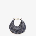 Made of chenille with the iconic FF motif in dark blue, decorated with vintage gold-finish metal FENDI lettering on the base, visible when the bag is worn.