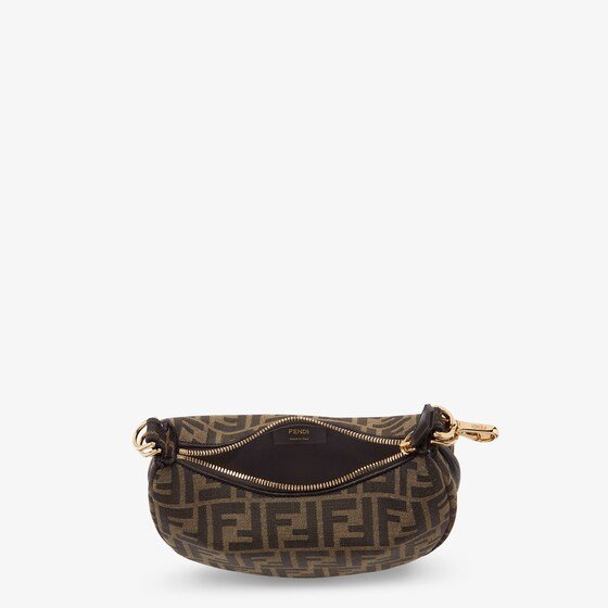 Mini hobo bag made of brown FF jacquard motif fabric, decorated with vintage gold metal FENDI lettering.