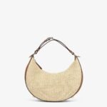 Small hobo bag made of natural-colored straw in a moss-stitch textured weave, with background and details in brown leather. With vintage gold metal FENDI lettering visible when the bag is worn under the arm.