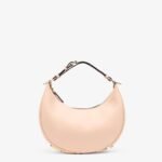 Small hobo bag made of soft pale pink leather, with vintage gold metal FENDI lettering visible when the bag is worn under the arm.