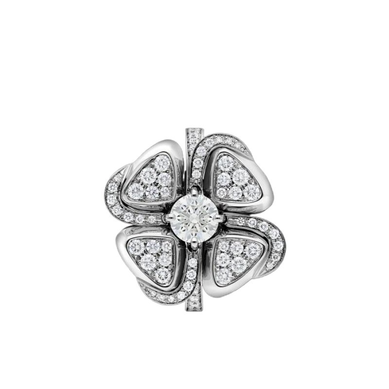 Blooming in the Eternal City of Rome, the Fiorever collection draws its design inspiration from the charming four-petal flower cherished by the Romans as a symbol of happiness and joy. Made up of two words rich in meaning: Fiore (flower in Italian) and forever (eternity in English), Fiorever celebrates the Romans?? love of life with a passionate and stunning design. Bvlgari highlights the rich and multifaceted beauty of nature with precious floral motifs, with four white gold diamond petals surrounding a central diamond, shining brightly. Fiorever ring in 18K white gold, set with a diamond and decorated with pave diamonds.