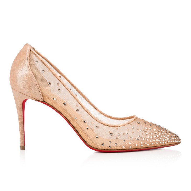A real-life glass slipper, the Follies Strass really makes a statement. A classically shaped stiletto with an 85 mm elegant heel, this iconic pump is adorned with hand-placed shimmering strass from toe to tip. Beneath the myriad of strass, the vamp is crafted from mesh, a nod to Christian??s love of transparency. For an ultra-luxurious feel, the heel on this neutral Light Silk version is wrapped in suede.