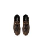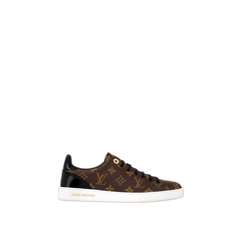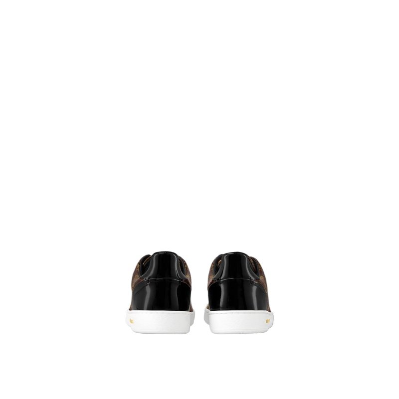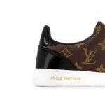 Reinterpreting the classic tennis shoe, this stylish sneaker in Louis Vuitton’s iconic patent Monogram canvas has a clean-cut design complemented by black patent leather trim and subtle gold metal details.