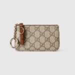 The GG Emblem collection reinterprets signature motifs through creativity and innovative functions , and is envisioned to be cherished for years to come. Introduced in the latest line of small accessories, this beige and dark brown key case is crafted from the new GG Monogram fabric. Featuring a zip closure with a leather puller, the inside features a keychain hook.