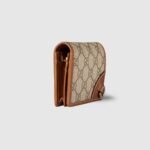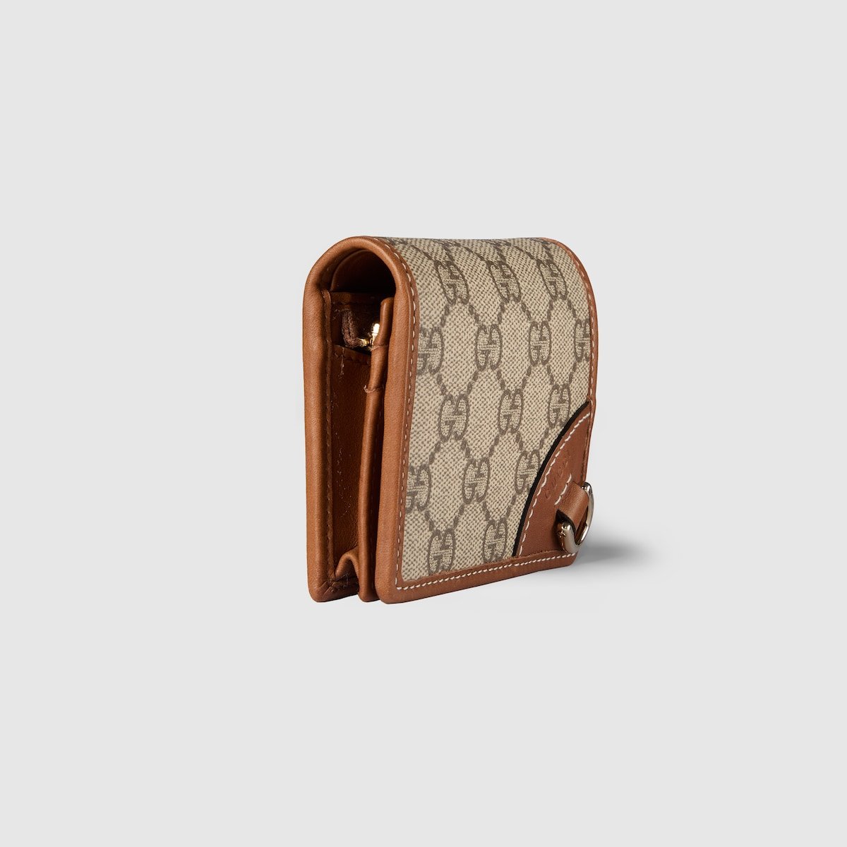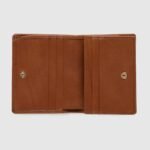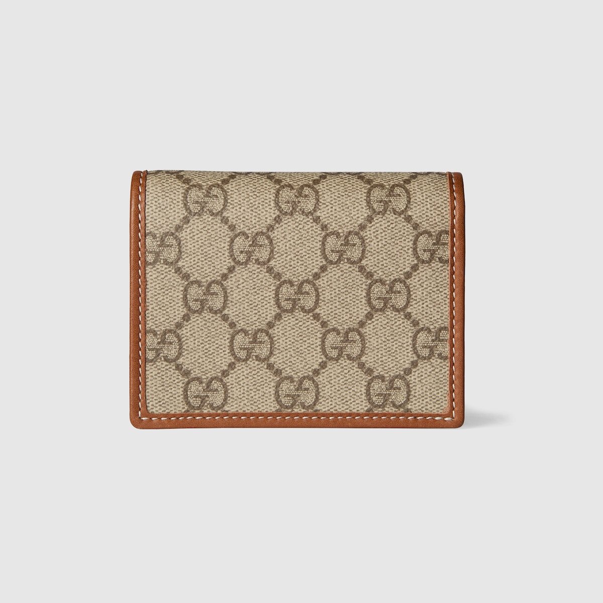 The new GG Emblem collection reinterprets the House??s history of elegance and craftsmanship. This beige and dark brown mini wallet is crafted from the new GG Monogram fabric. Featuring multiple compartments, it closes with a functional snap button.