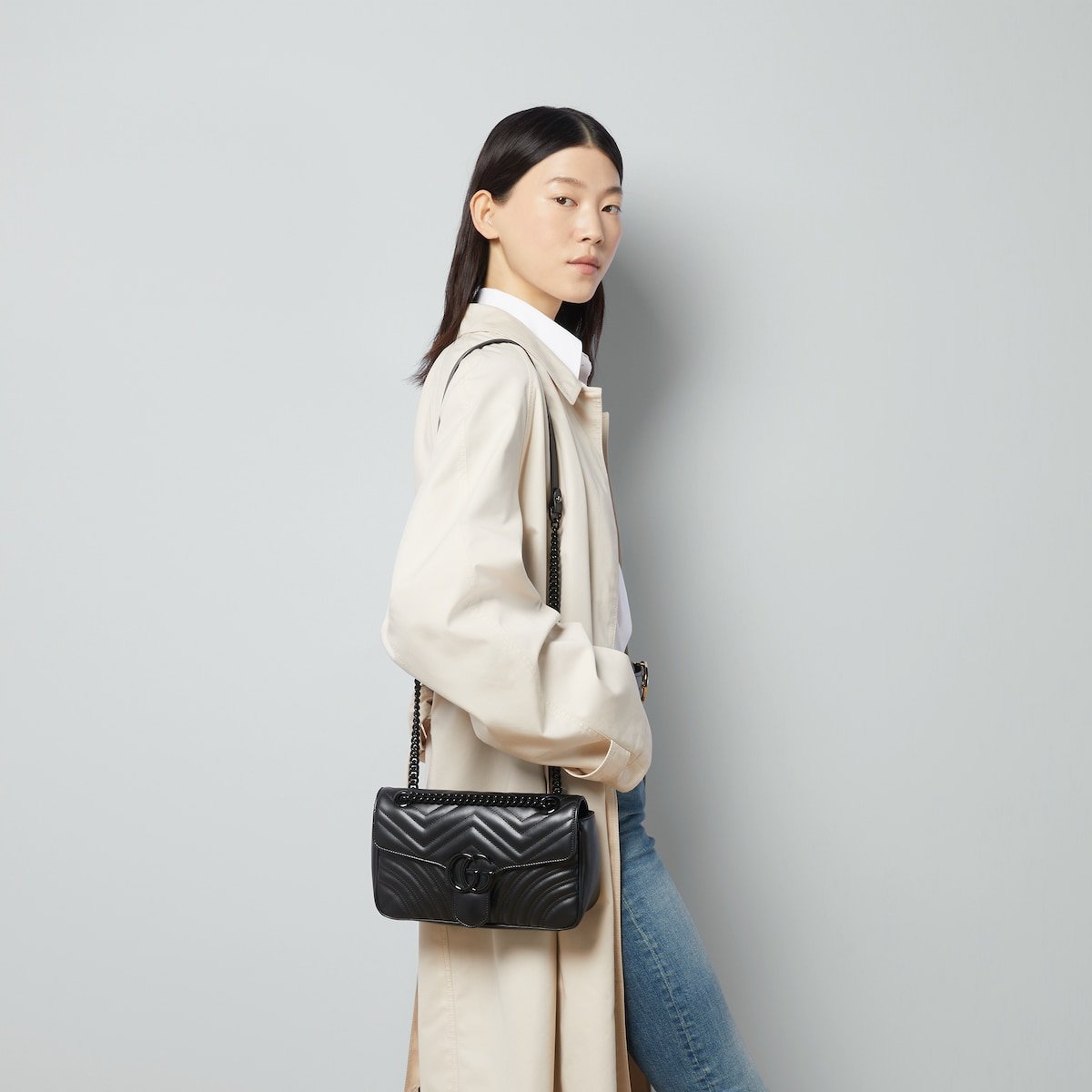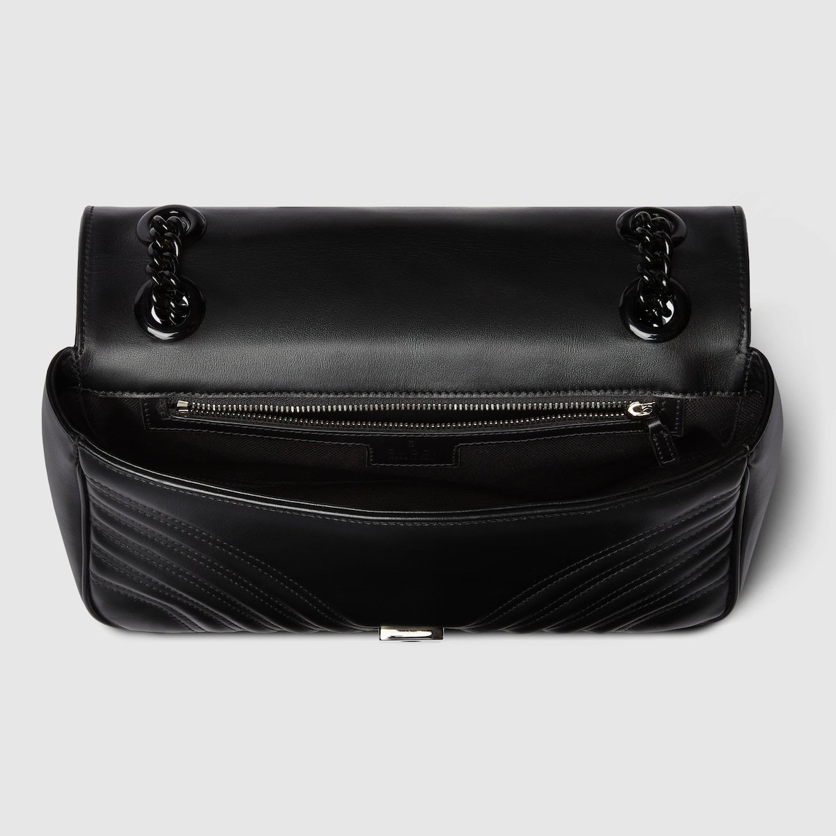 The small GG Marmont chain shoulder bag has a softly structured shape and an oversized flap closure with Double G hardware. The sliding chain strap can be worn multiple ways, changing between a shoulder and a top handle bag. Made in matelass?? chevron leather, the accessory is introduced for Gucci Love Parade with monochrome hardware.