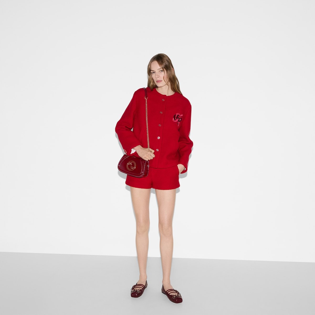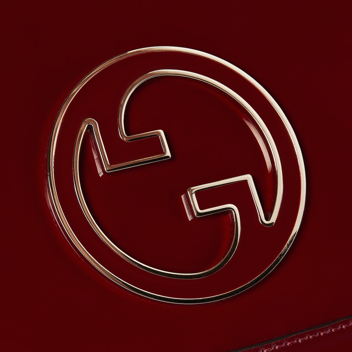 The new Gucci Blondie bag, whose distinctive logo first appeared in the House??s collections in the early 1970s, weaves together past and present in a fusion of nostalgia and modernity. This mini shoulder bag with a gold-toned chain is crafted from Gucci Rosso Ancora red patent leather, featuring the House’s round symbol in enamel.