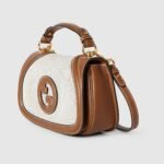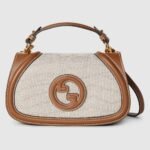 The new Gucci Blondie bag, whose distinctive logo first appeared in the House??s collections in the early 1970s, weaves together past and present in a fusion of nostalgia and modernity. Presented in fresh beige cotton linen canvas and smooth brown leather trim, this small bag is complete with a top handle and adjustable shoulder strap.