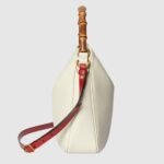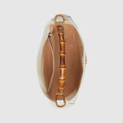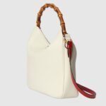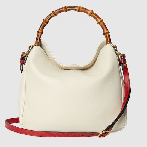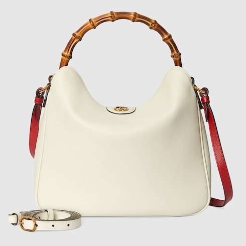 Combining recognizable elements of the House, the medium-sized shoulder bag is defined by its bamboo handles and Double G hardware. Crafted from white leather, the accessory is further accentuated a contrasting red leather shoulder strap.