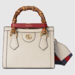 An evolution of a bamboo handle tote first introduced in 1991, the Gucci Diana represents the notion of style in constant evolution and is reimagined with removable, neon leather belts??a nod to the functional bands used to keep the handles in shape. Here, a mini version of the emblematic style is presented in white leather.