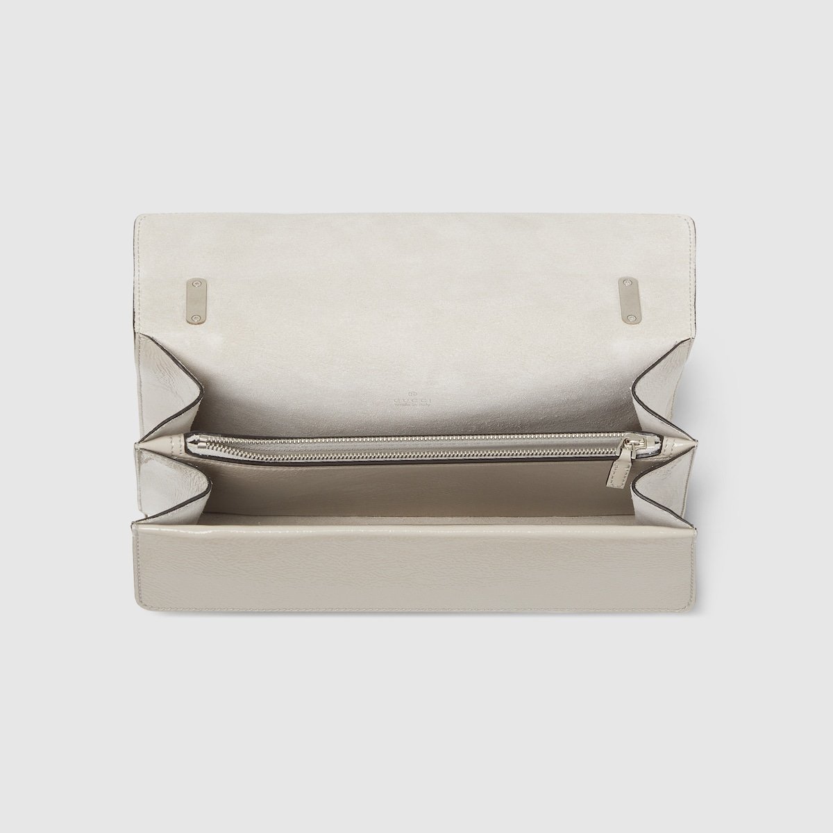 A soft, deconstructed version of the signature Dionysus shoulder bag presents a contemporary look. This style in sleek light grey patent leather features the iconic tiger head closure with a flap and a sliding chain that can be worn both as a shoulder bag and a top handle bag, giving it many possibilities to wear.