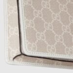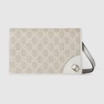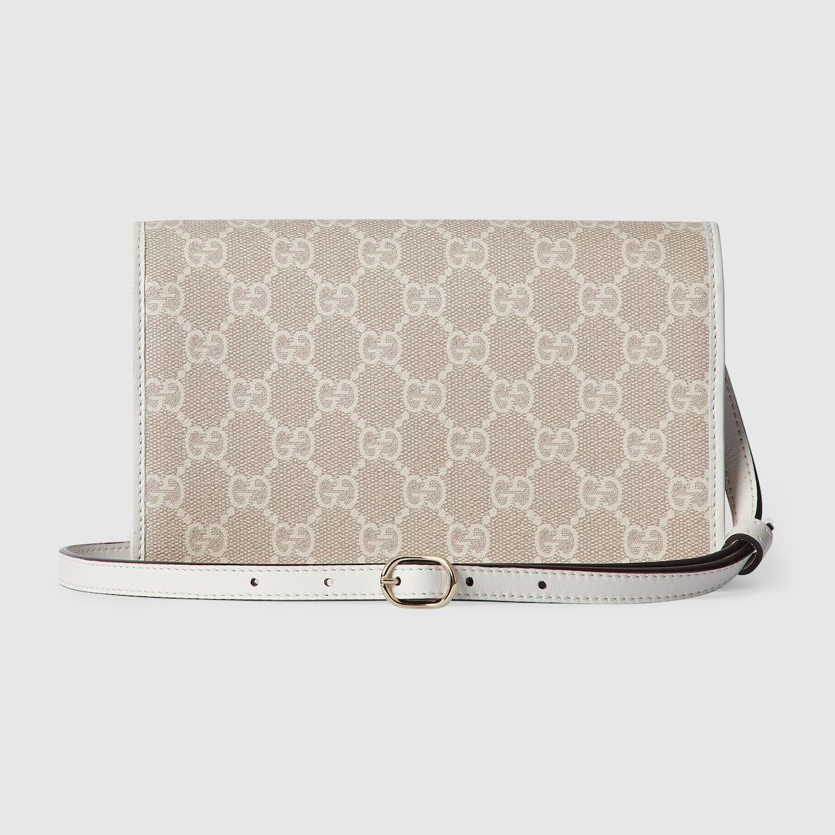 The GG Emblem collection reinterprets signature motifs through creativity and innovative functions, and is envisioned to be cherished for years to come. Introduced in the latest line of small accessories, this beige and white shoulder bag is crafted from the new GG Monogram fabric. Featuring an off white leather trim, the design comes with an embossed Gucci logo.