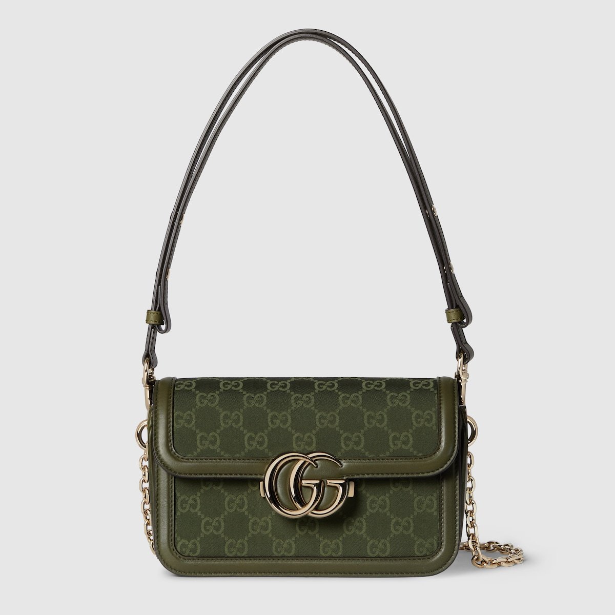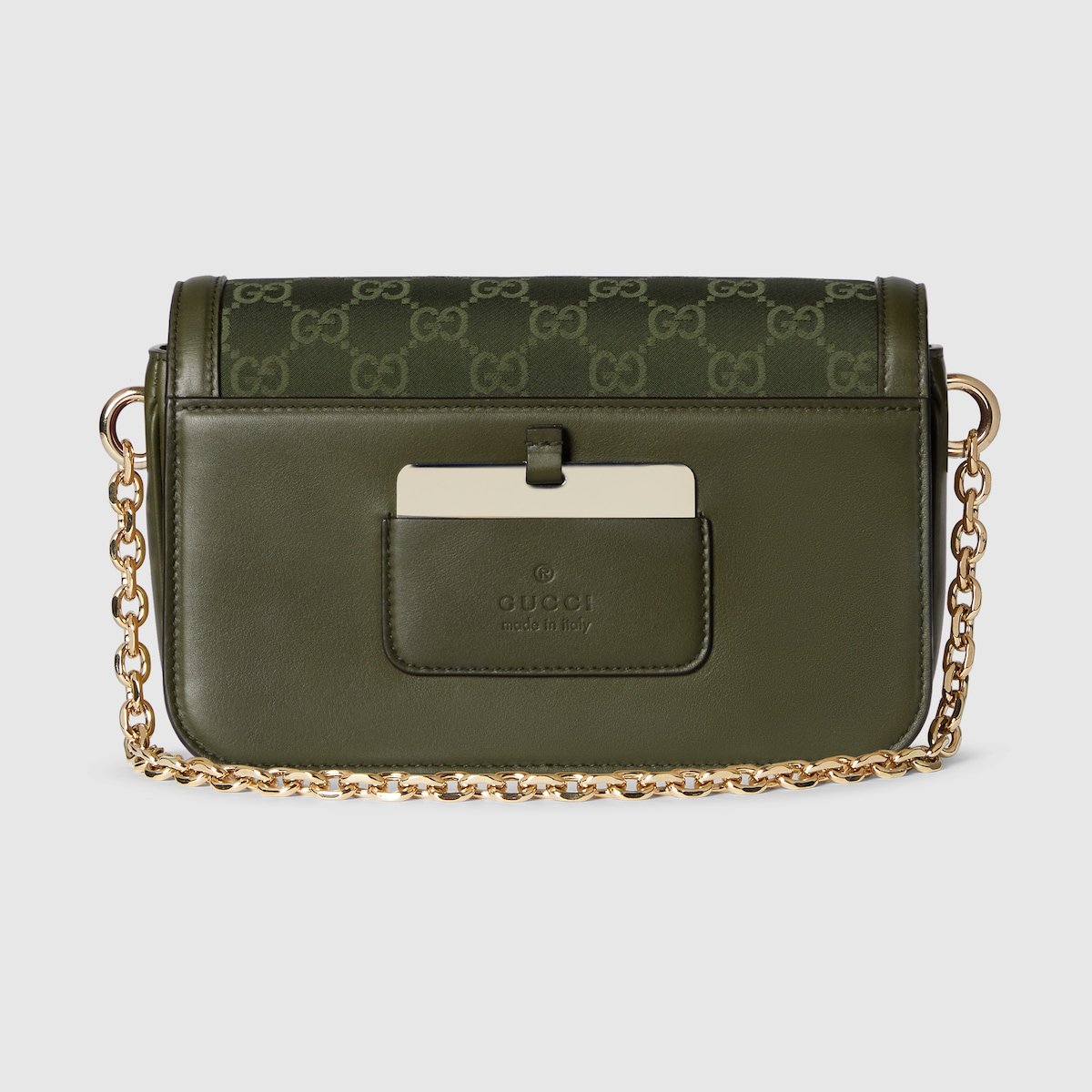 The Gucci Go is made for movement. In the Spring Summer 2025 collection, this shoulder bag is characterized by sophisticated yet lightweight GG canvas and a refined chain strap. It also features functional internal organization, and a detachable mirror on the back.