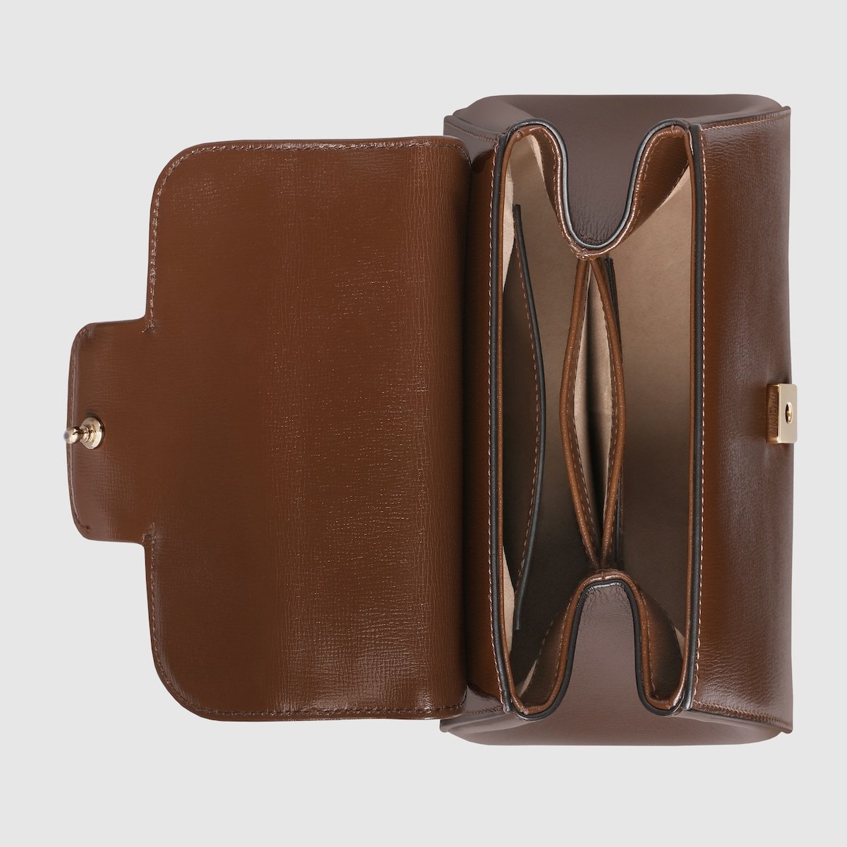 The Gucci Horsebit 1955 is presented as a top handle bag in light brown leather. The collection unifies details first introduced on the original bag that inspired the line from over six decades ago with a modern spirit, highlighting the Horsebit. Part of Gucci??s genetic code, the double ring and bar design has been established as one of the most distinctive elements among the House symbols borrowed from the equestrian world.