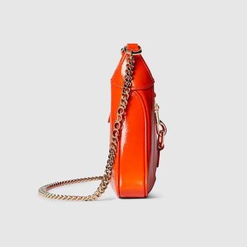 The Jackie Notte is a new handbag designed for Gucci by Creative Director Sabato De Sarno. It embodies the self-confidence of the iconic Jackie line, with a new silhouette and subtle details that make it perfect for nighttime wear. Orange patent leather, a hook closure, and light gold-toned Gucci lettering chain strap give this mini shoulder bag a unique touch.